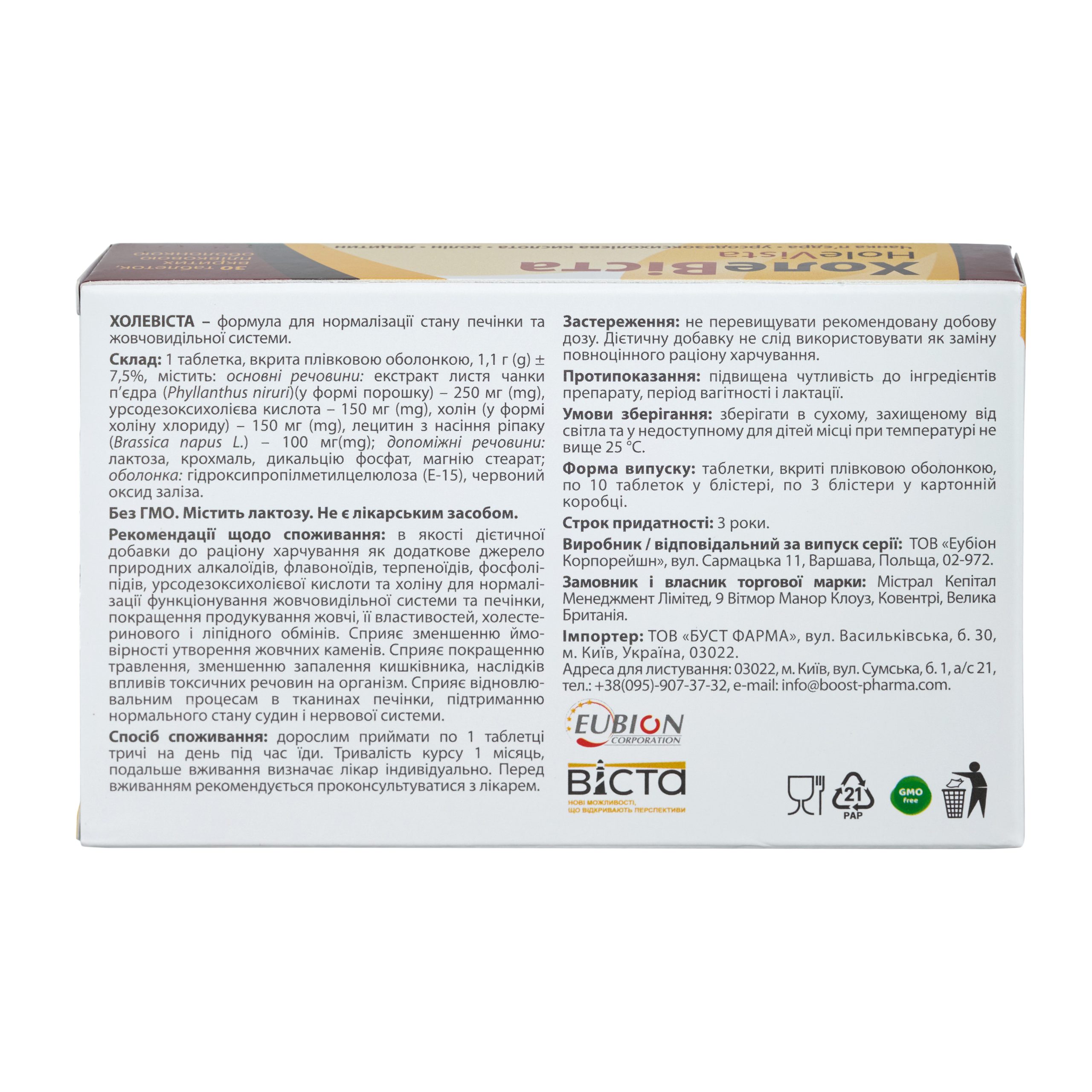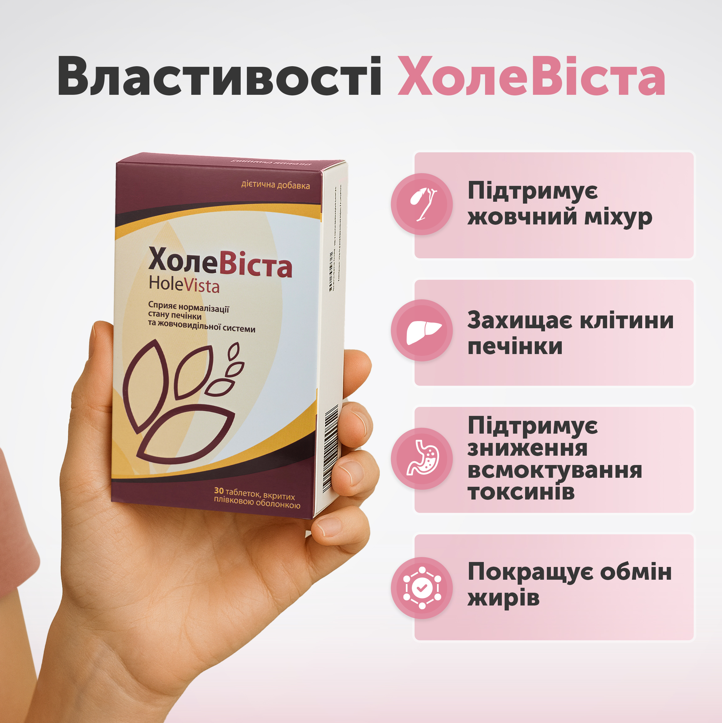 ХОЛЕВІСТА – це комплексна формула для здоров’я печінки та жовчовивідної системи. Завдяки поєднанню чанка п’єдра, урсодезоксихолієвої кислоти, холіну та лецитину продукт сприяє природному очищенню організму, нормалізує жовчовиділення та підтримує оптимальний обмін жирів.