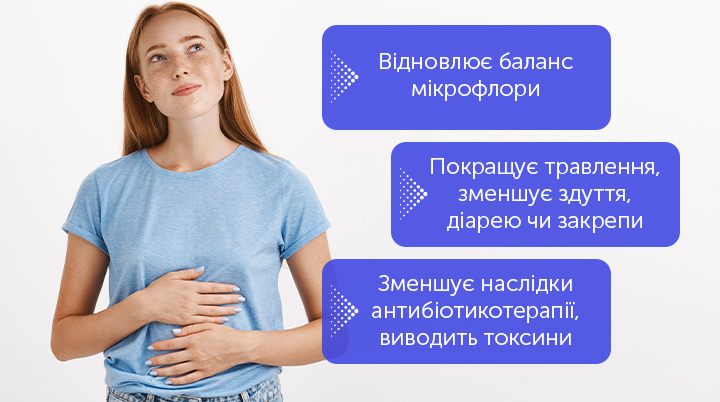 • Відновлює баланс мікрофлори — нормалізує співвідношення корисних і шкідливих бактерій у кишківнику.