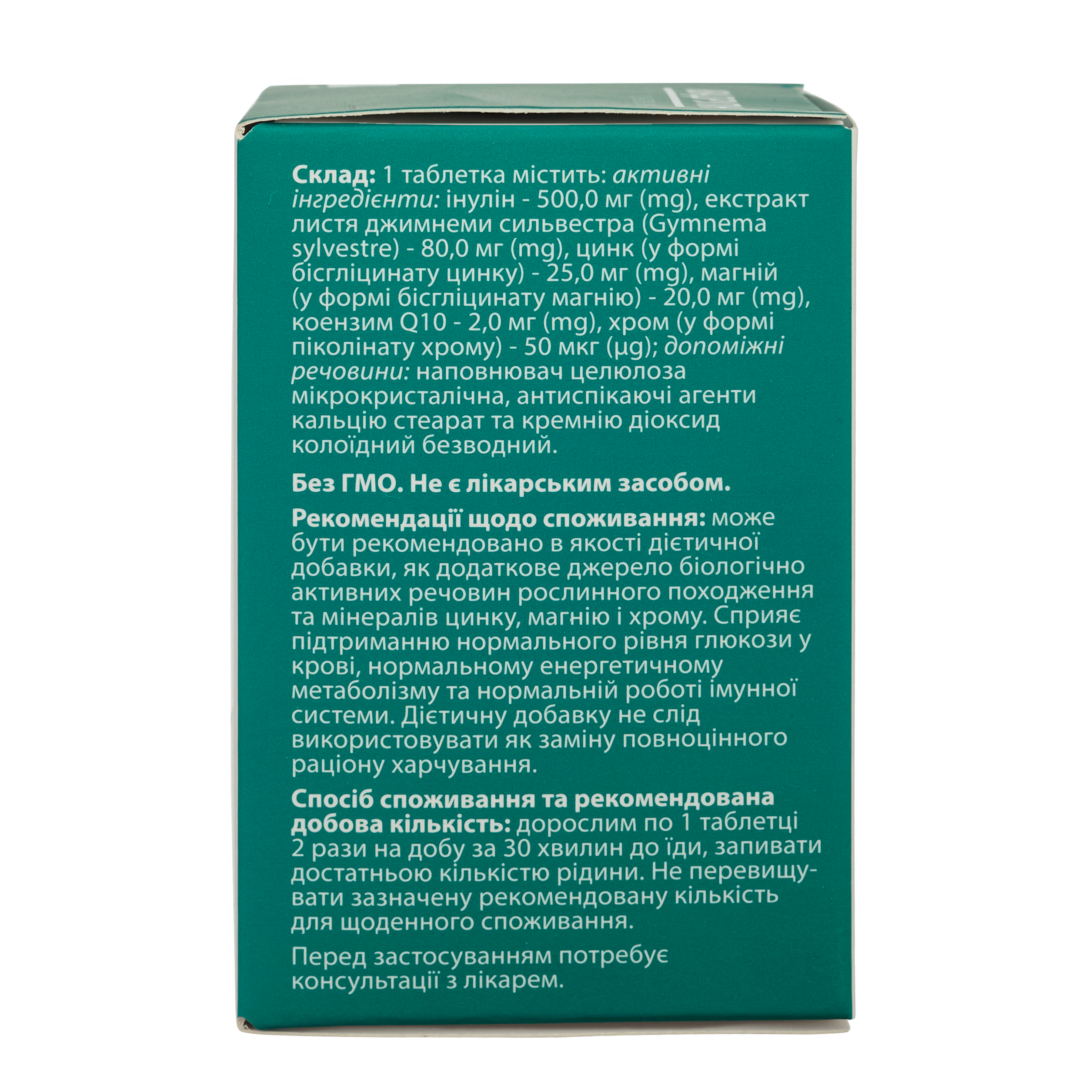 Комплекс інуліну, джимнеми, цинку, магнію, хрому та коензиму Q10 допомагає підтримувати стабільний рівень глюкози, знижує тягу до солодкого та покращує обмін речовин. Сприяє нормальній роботі підшлункової залози, захищає судини й дарує енергію щодня.