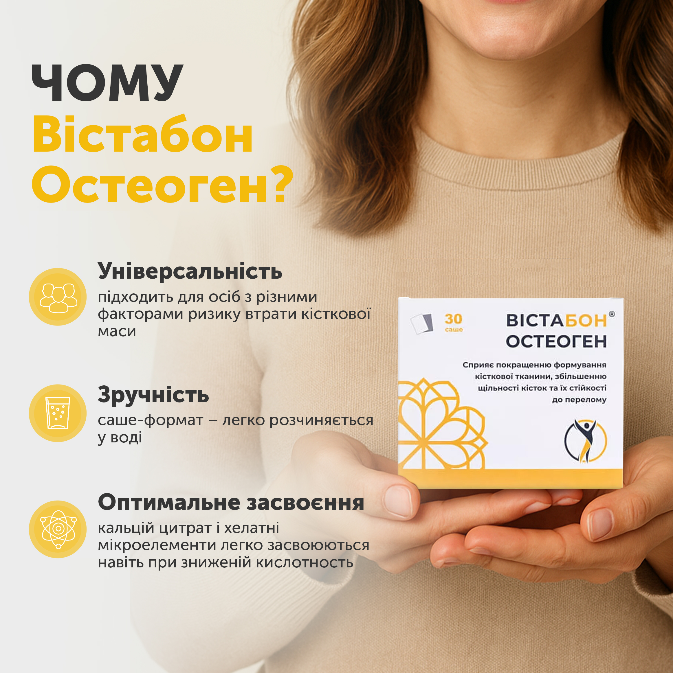 Мені 67 років. Після обстеження лікар поставив діагноз остеопенія і призначив приймати Вістабон Остеоген. Почала курс, п’ю щодня після їжі. Подобається, що в складі є і кальцій, і вітамін D, і ще цілий комплекс мікроелементів — не треба купувати купу всього. Засіб легко розчиняється у воді, смак приємний. мені потрібні міцні кістки, це для мого віку дуже важливо