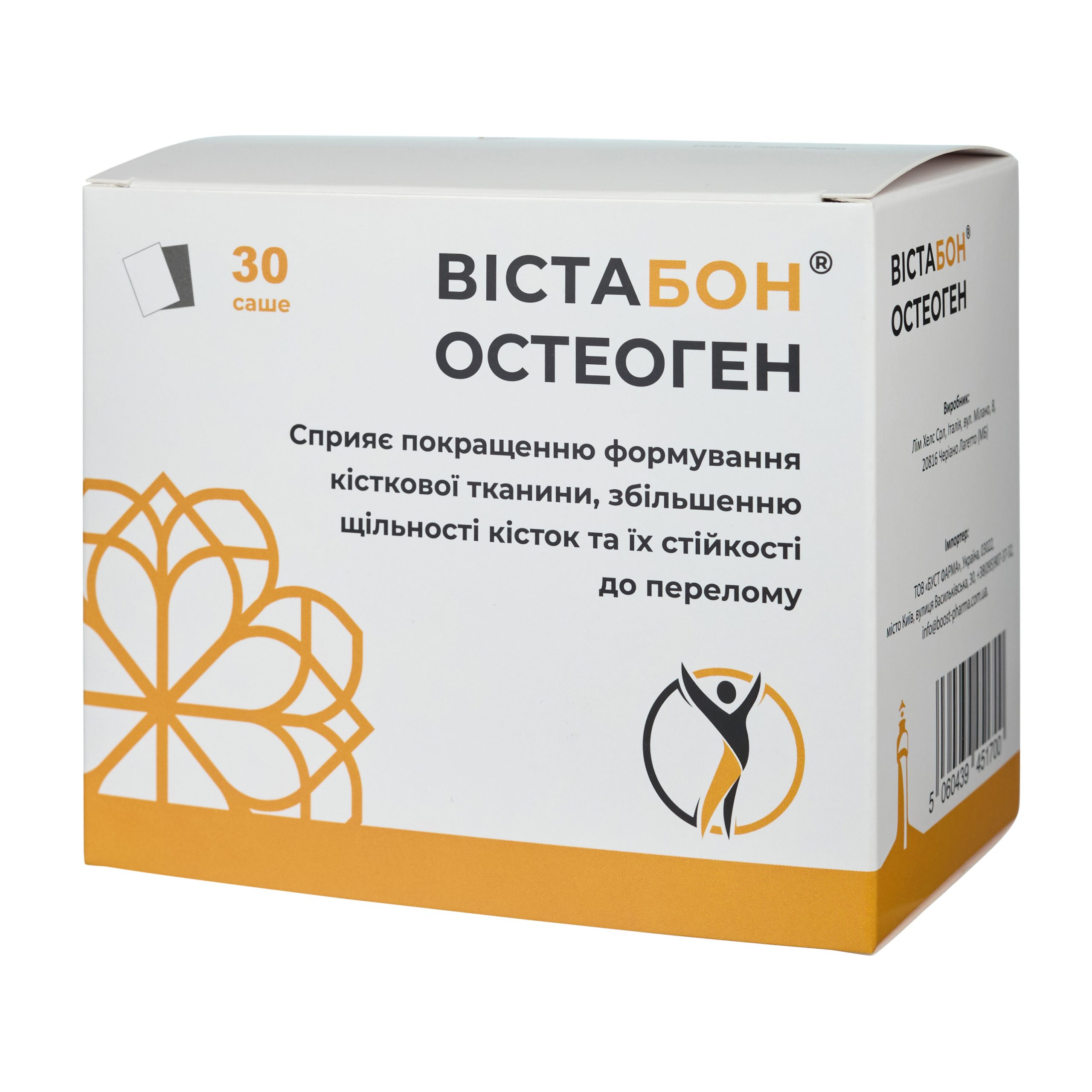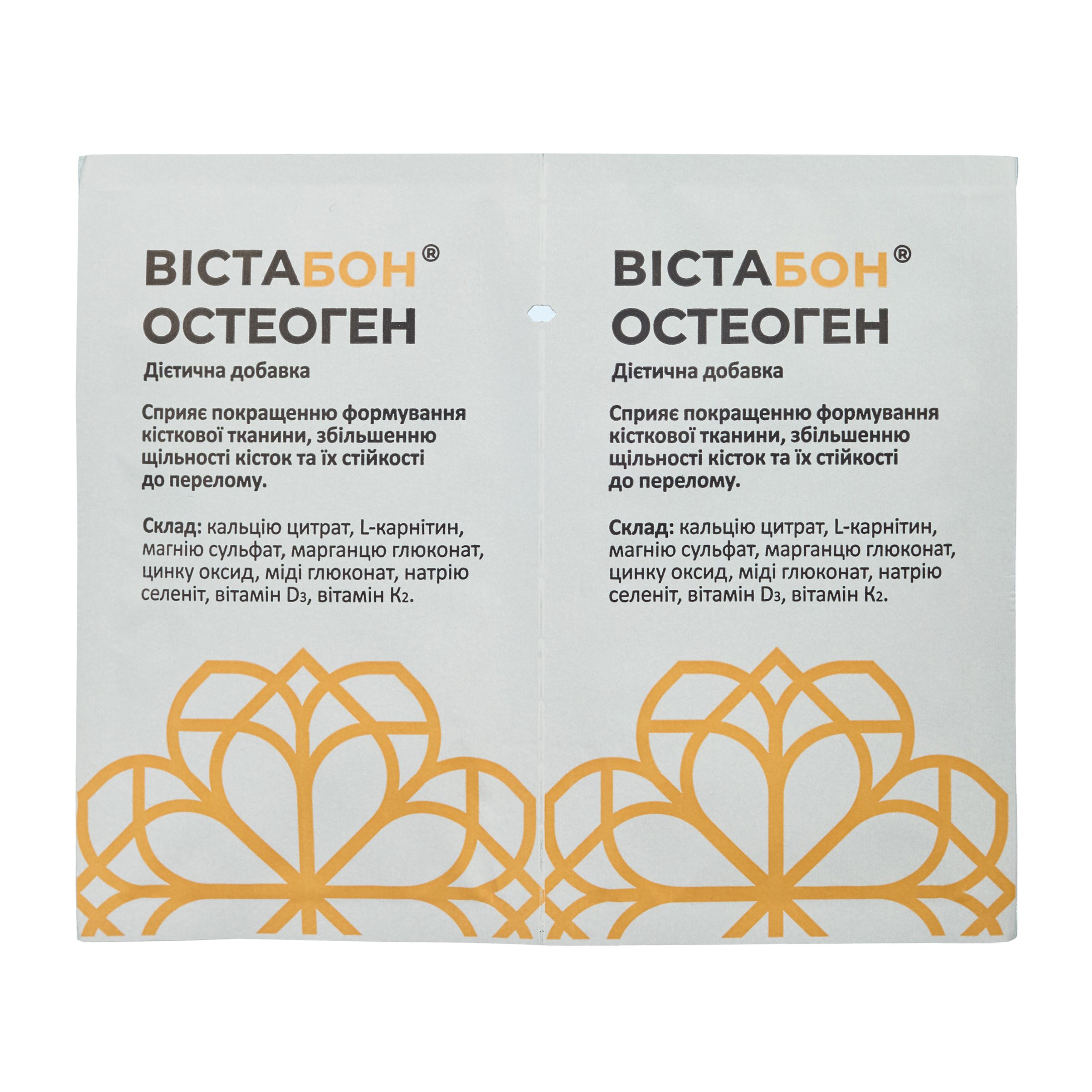 1 пакетик (саше) Вістабон® Остеоген містить: кальцію цитрат – 2000 мг (що відповідає 477 мг кальцію – 60% NRV*), L-карнітин – 250 мг, магнію сульфат – 200 мг (що відповідає 19,7 мг магнію – 5,5 % NRV*), марганцю глюконат – 8,1 мг (що відповідає 1 мг марганцю – 50% NRV*), цинку оксид – 8 мг (що відповідає 6,43 мг цинку – 64% NRV*), міді глюконат – 7,14 мг (що відповідає 1 мг міді – 100% NRV*), натрію селеніт – 54,8 мкг (що відповідає 25 мкг селену – 46% NRV*), вітамін D3 – 15 мкг (600 МО – 300% NRV*), вітамін К2 – 10 мкг (13% NRV*).